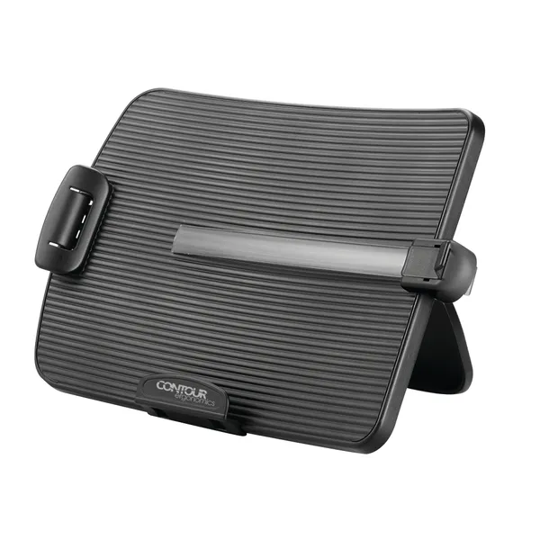 This Contour Ergonomics Desktop Copyholder features a curved design, which offers multiple viewing angles, whilst reducing glare for comfort. The copyholder can be used in either portrait or landscape orientation and features 2 angle adjustments for viewing comfort. This black copyholder can hold up to 30 A4 sheets.