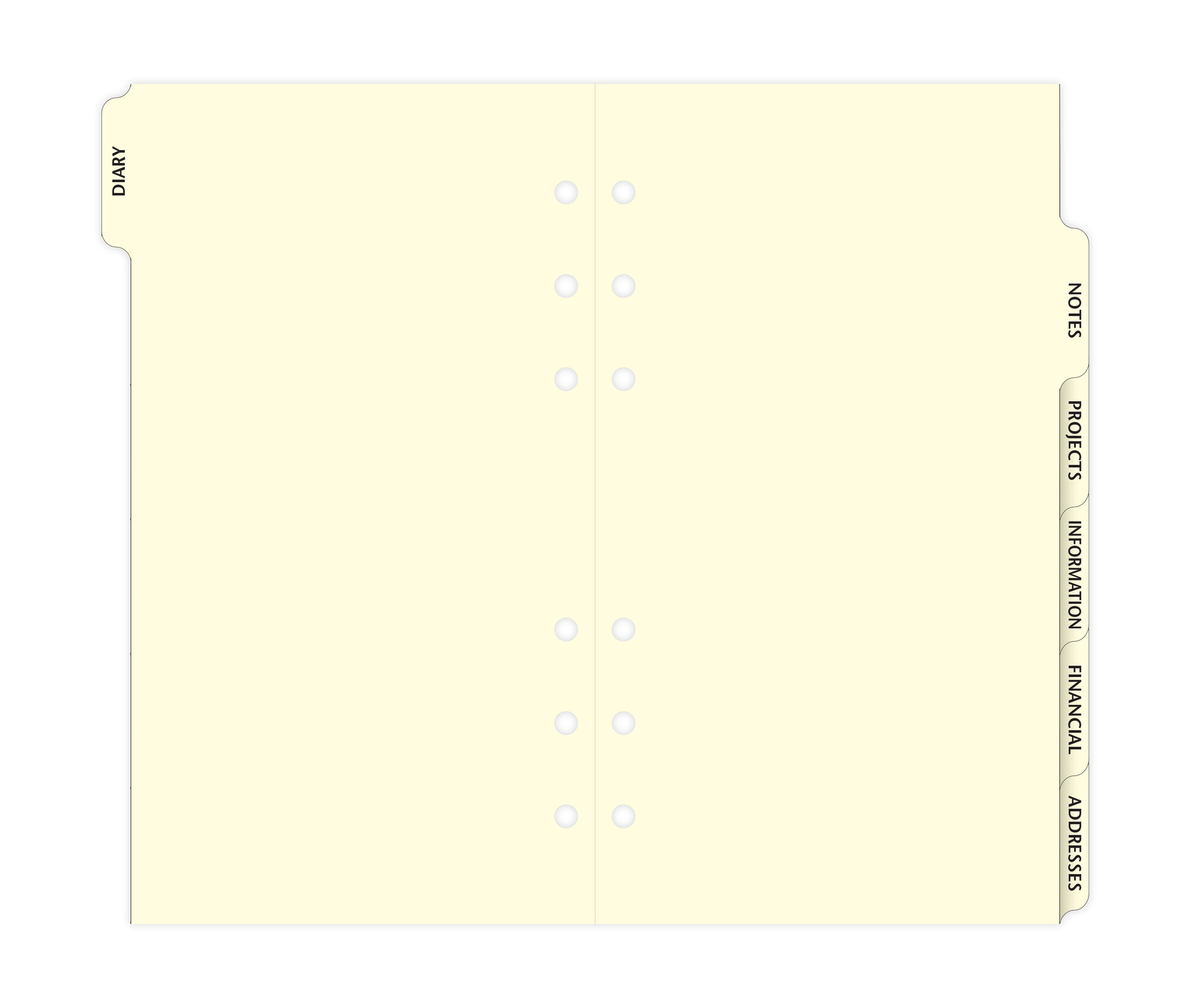 Organise your life by subjects or tasks with six pre-printed tab dividers in cotton cream for your Filofax Personal Organiser or Personal Clipbook.