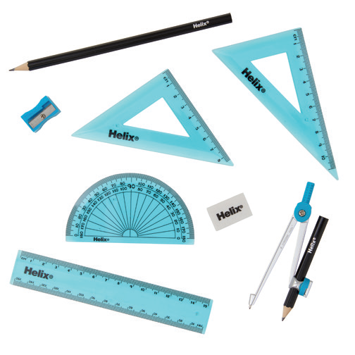 Includes self-centring metal compass and 9cm pencil + 17.5cm pencil + sharpener + eraser + 15cm rule + 45 & 60 degree set squares + 180 degree protractor.