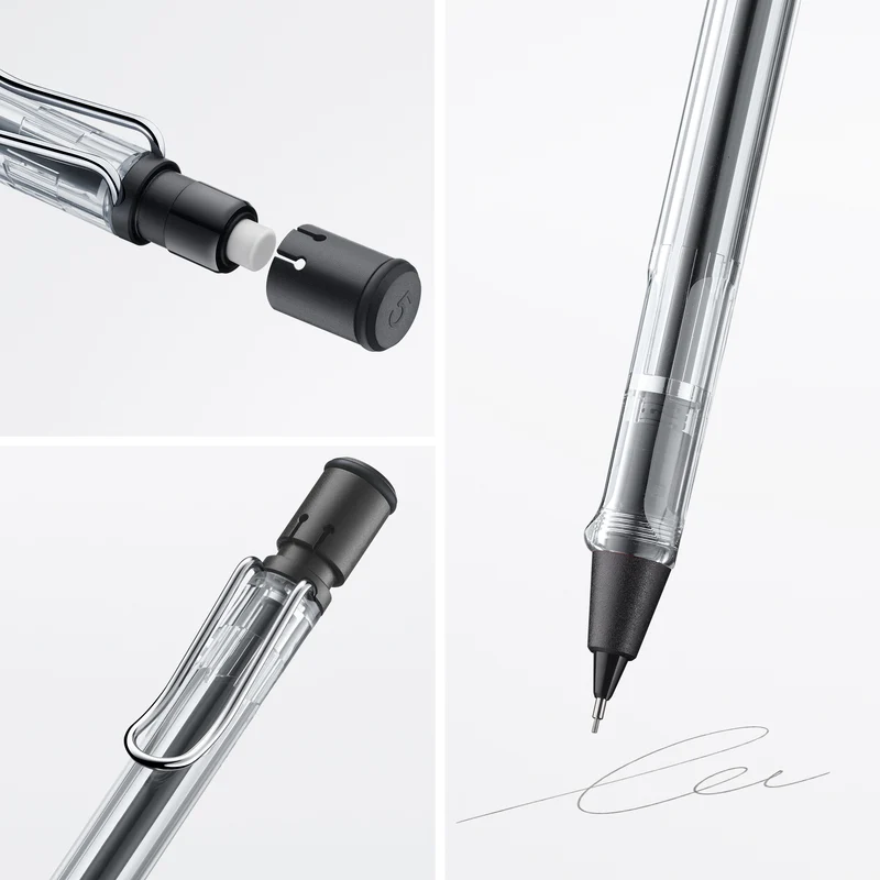 Mechanical pencil for everyday use with ergonomic grip. Distinctive metal clip and resistant body made of matt ASA plastic. Including pencil lead refill LAMY M 41 in size 0.5 mm and eraser LAMY Z 18 with cleaning needle.