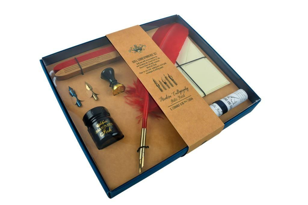 Set contains: A large red Quill with an Accommodation tip & Drawing nib, two Leonardt nibs, 25ml black ink, traditional sealing wax with wick ? red & gold, ceramic mini seal, envelopes, writing paper and Art of Writing leaflet.