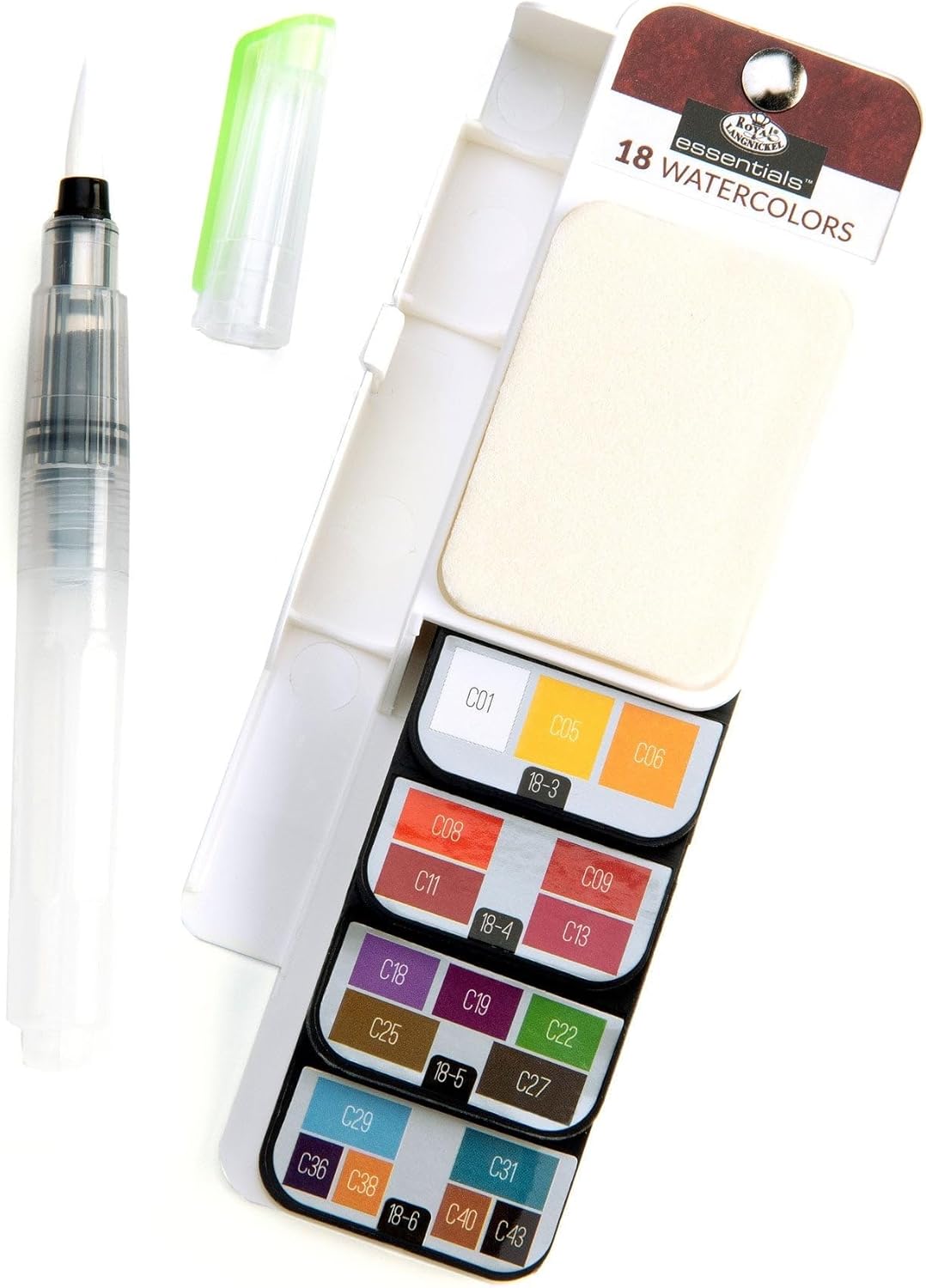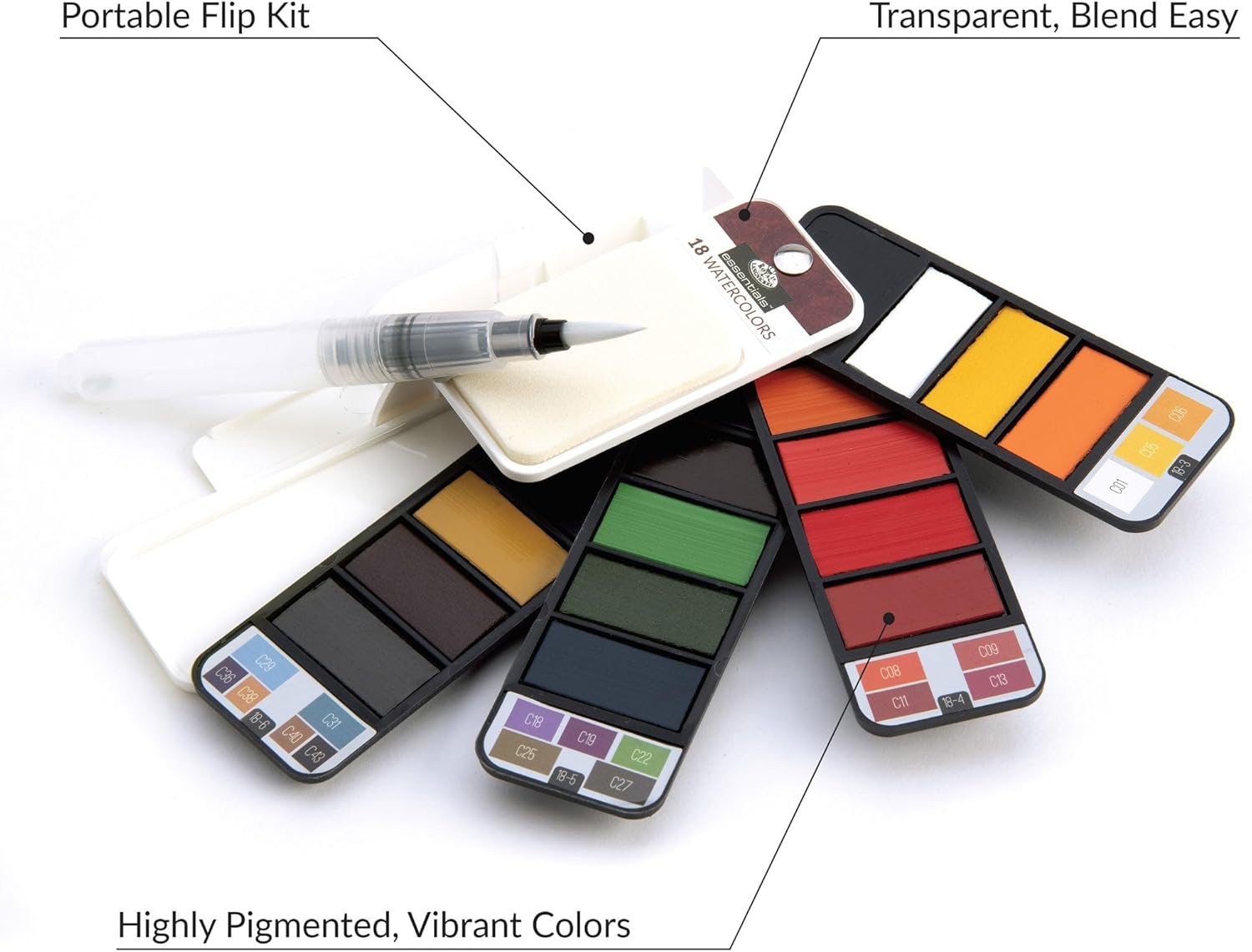 Royal & Langnickel Essentials 19 pc Watercolor Travel Flip Kit is essential for any artist. Paint watercolor art on-the-go! Sleek, compact design. Fits easily in your backpack, drawer or carrying case! 18 different watercolors and one Aqua-Flo pen. Create endless combinations of color! This convenient, travel-friendly Flip Kit is ideal for any level artist. Beginner to advanced.