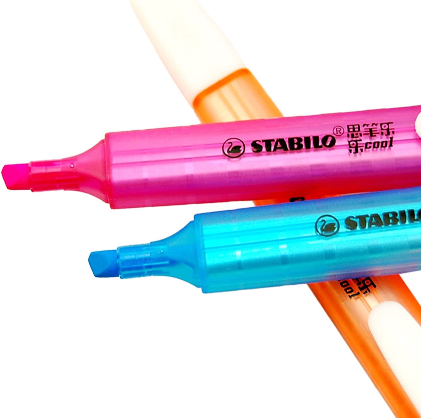The STABILO swing cool pocket-sized highlighter in a pack of 6 with the fluorescent colors yellow (24), blue (31), green (33), turquoise (51), orange (54) and pink (56).