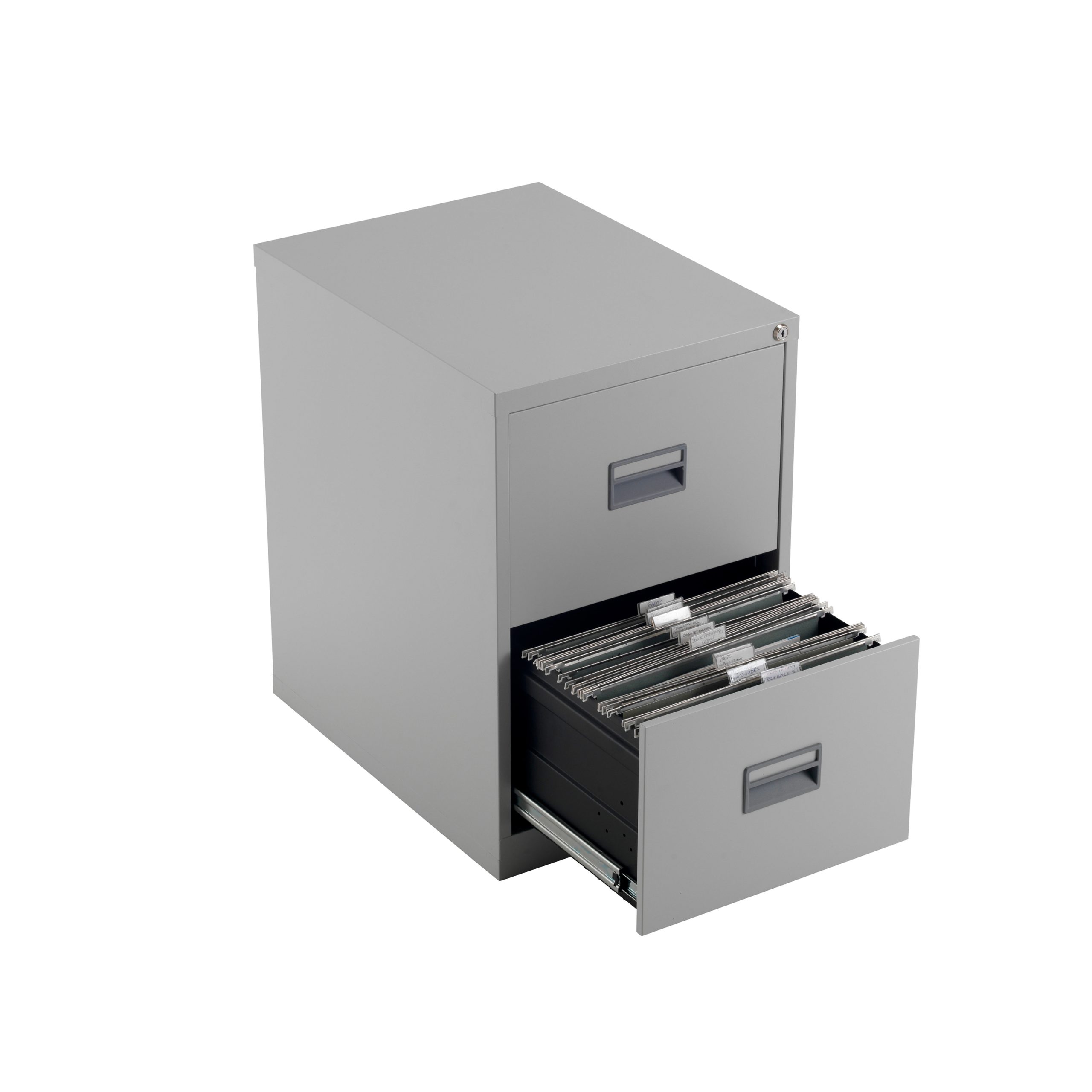 With drawers that are 100% extendable for full access to the contents, these 2 drawer filing cabinets have a fully welded construction and lockable doors for use in virtually any environment. Suitable for Foolscap files, the unit also benefits from an anti-tilt system that only allows one drawer to be opened at a time and has plastic inset drawer handles incorporating a card holder for easy identification and labelling. Each drawer has a weight capacity of 40kg