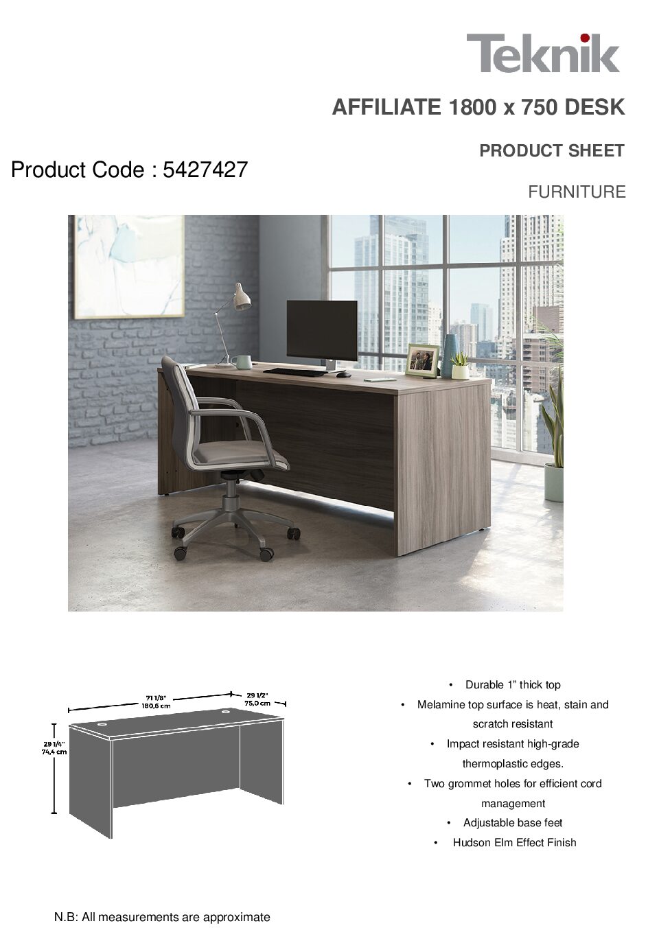 The Teknik Office Affiliate 1500 x 800 Bow Front Desk is our functional and commercial style option for all manner of colour schemes and work spaces. This large attractively curved desk offers a very durable 1 thick melamine heat, stain and scratch resistant top to hold up your laptop, favourite beverage and display items with ease. It comes with two handy grommet holes for easy cord management and the adjustable base feet will ensure it stays perfectly level on even the most uneven floors. The desk is also impact resistant with its high grade thermoplastic edges. Beautifully finished in a Hudson Elm effect, this Desk also benefits from a 360 degree finish for adaptable placement within your office. There are also other matching cupboards, desks, hutches and bookcases within the Affiliate range which will complement this item