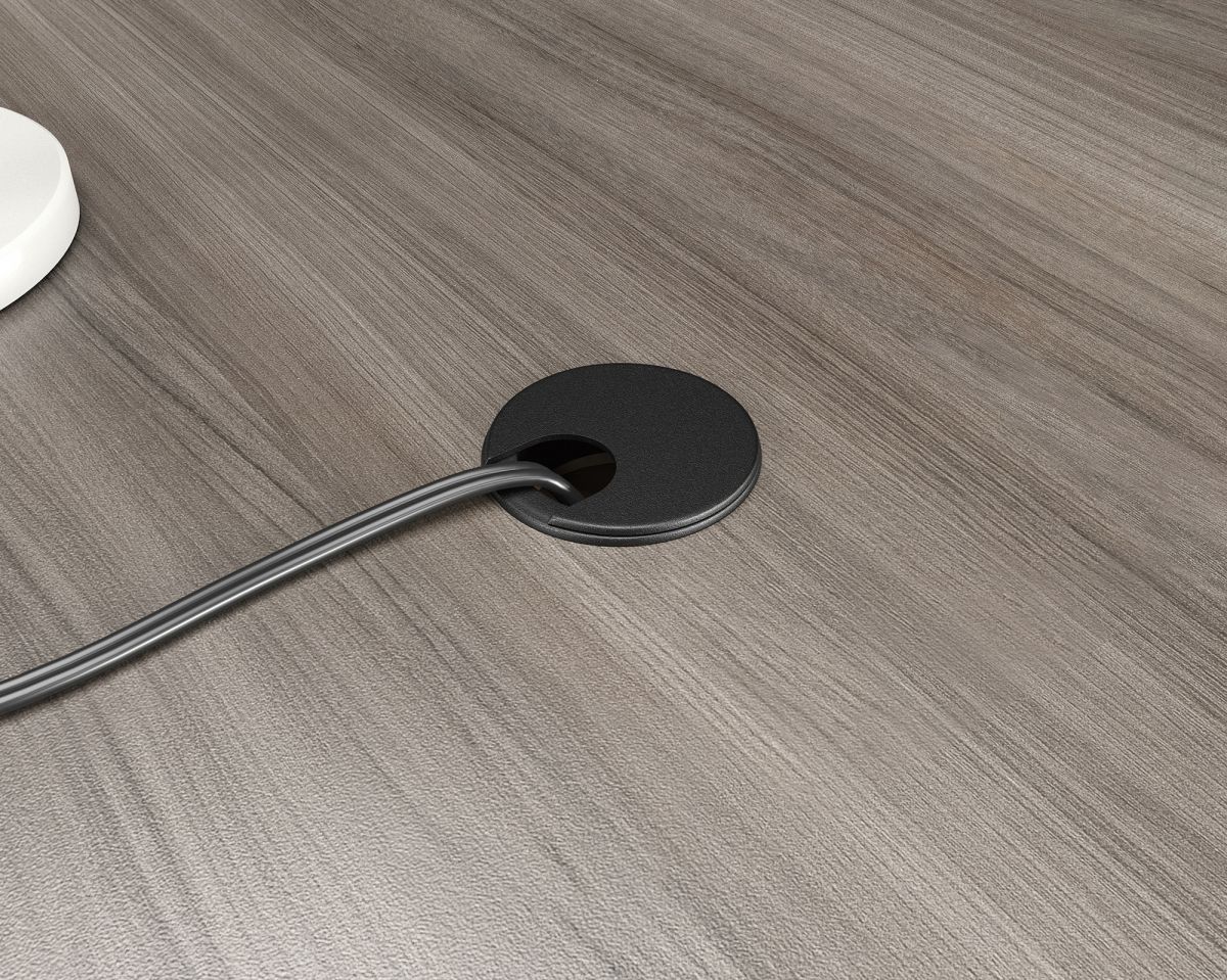 Teknik Office Affiliate Bow Front Desk with Hudson Elm Effect Finish, Adjustable base feet, and two grommet holes for efficient cord management.