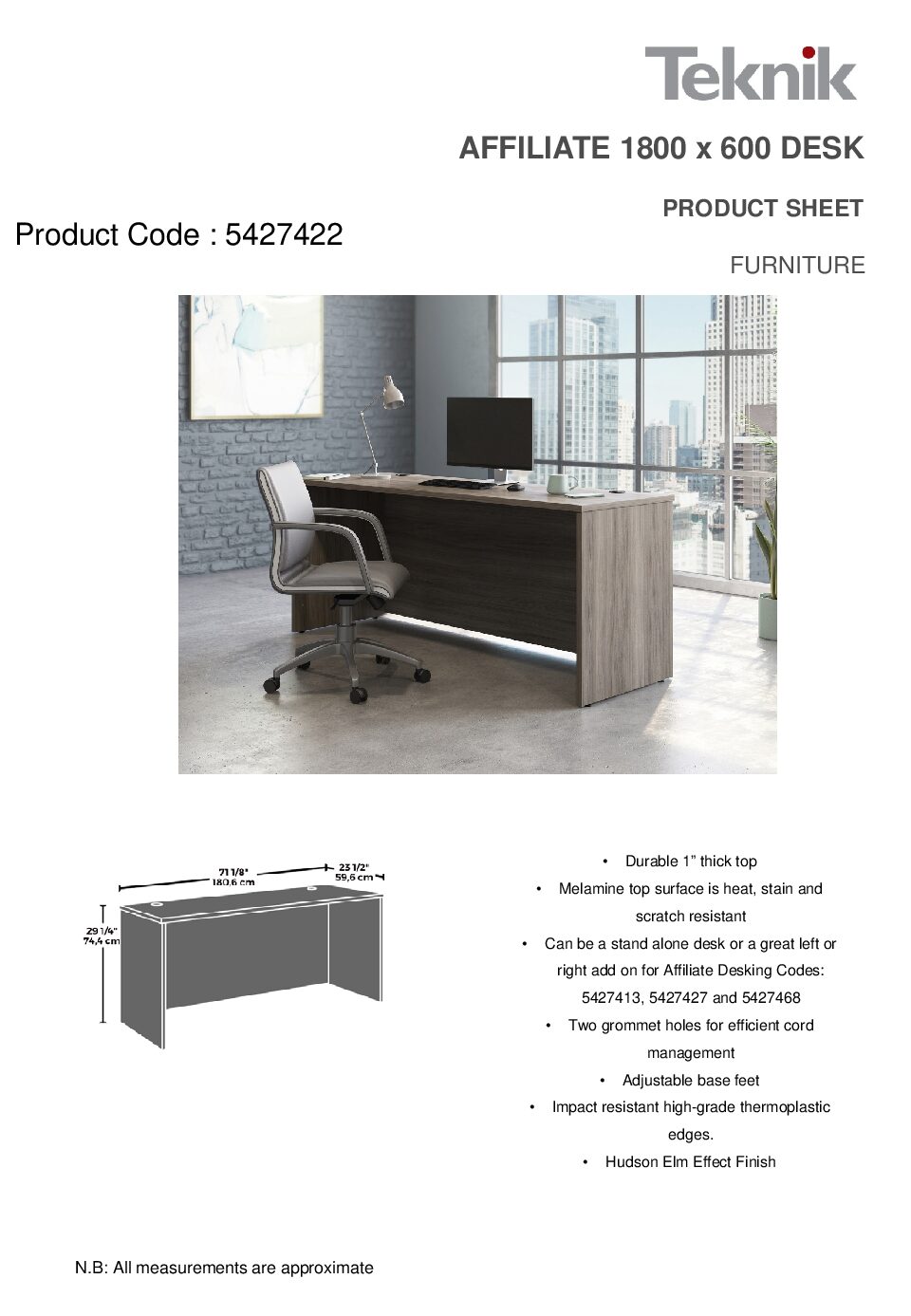 The Teknik Office Affiliate 1800 x 600 Desk is our functional and commercial style option for all manner of colour schemes and work spaces. This compact desk offers a very durable 1″ thick melamine heat, stain and scratch resistant top to hold up your laptop, favourite beverage and display items with ease. It comes with two handy grommet holes for easy cord management and the adjustable base feet will ensure it stays perfectly level on even the most uneven floors. Beautifully finished in a Hudson Elm effect, this Desk also benefits from a 360 degree finish for adaptable placement within your office. It can be used as a stand alone desk or can be fastened to the left or right side of these Affiliate desking codes: to 5427413, 5427427 and 5427468 to extend your work area. There are also other matching cupboards, desks, hutches and bookcases within the Affiliate range which will complement this item.