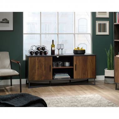 Teknik Office Canyon Lane TV Stand in Brew Oak finish and Grand Walnut accents, accommodates up to a 60″ TV, can be used as a display unit or credenza, has hidden storage behind sliding doors and a powder coated metal base.